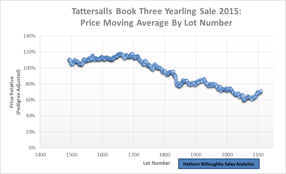 Whilst aggregate prices were down, we noticed during Book Three that earlier lots were selling for higher prices than lots catalogued later in the sale. In Graph 1 below a moving average of prices relative to the sale median is shown in lot order. There is a pedigree quality correction included in prices to account for differences in pedigrees between lots, and vendor buybacks an unsold lots are excluded. Lots were catalogued on both days according to dam name, in order from W to V. Prices achieved were lower on day two relative to day one. Pedigrees were less good on day two relative to day one, which explains the difference that can be seen in day one (up to lot 1773) and day two (lot 1774 onwards) . However just looking at day two prices were 20% to 40% lower towards the end of the day than at the beginning. These are large numbers. Given lots are catalogued in order of the first letter of the name of the dam by day, it wasn’t a year to be consigning a yearling out of a dam whose name began between R and V on day two.