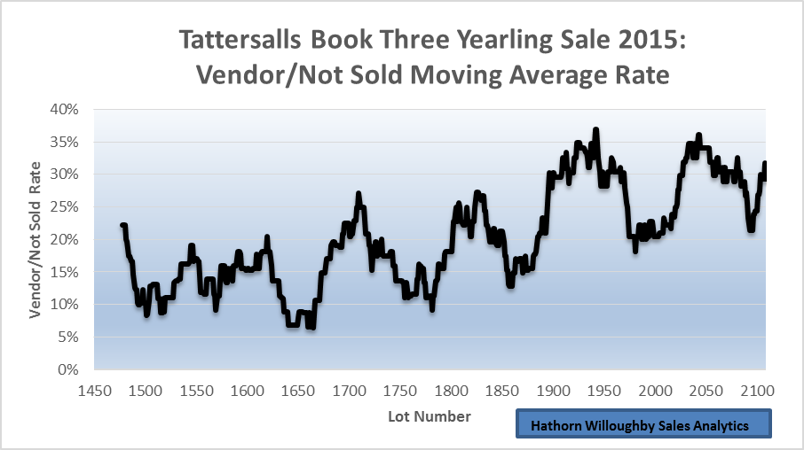Allied with prices, we can look at rates of vendor buybacks and unsold lots. See Graph 2 below, which charts a moving average of the rate of vendor/not sold lots in lot order. Consignors reacted to price falls by buying back their yearlings if reserves were not met.